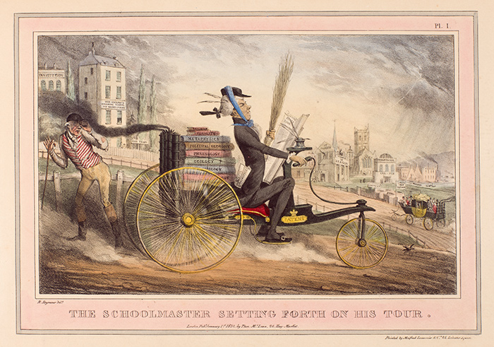 Seymour was a prolific comic illustrator, and The Huntington has several other very rare examples of his superior artwork. One of my favorites is The Schoolmaster Abroad (1834). Brougham is the target again. In this instance, Seymour is mocking Brougham’s role as a leading figure in working-class education. But what strikes me is the energy, vividness, and joyful inventiveness of the cartoons. The first image in this book shows Brougham riding what can only be described as a 19th-century motorcycle powered by steam, his books perched perilously close to the exhaust system. Below him is a horseless stagecoach, a comic example of technological and industrial progress that resembles an object from science fiction. Needless to say, Brougham’s attempts to convert the British people to his gospel of “useful knowledge” fall on deaf ears.