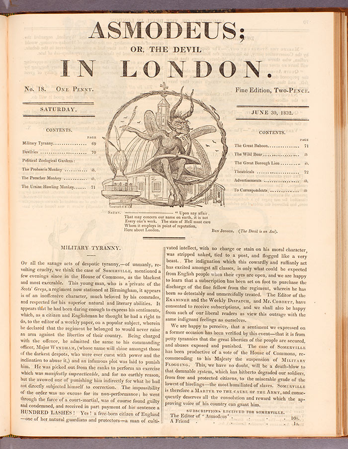 Robert Seymour, front page of Asmodeus; Or the Devil in London, June 30, 1832. Seymour reached out to a working-class readership who could afford to pay just one penny for a monthly installment of this series. The Huntington Library, Art Collections, and Botanical Gardens.
