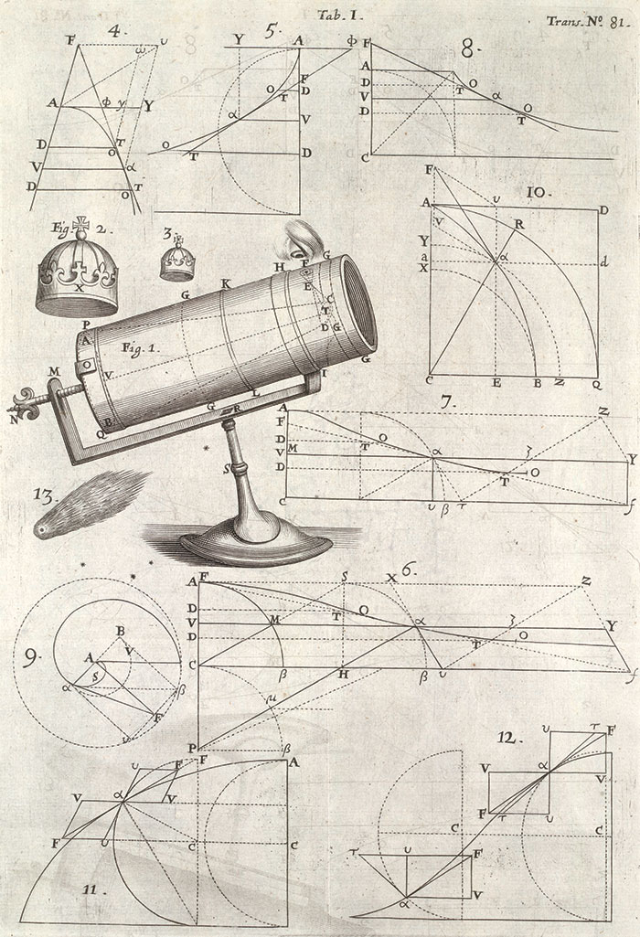 Illustration of Isaac Newton’s reflecting telescope in An Account of a New Kind of Telescope, invented by Mr. Isaac Newton, Philosophical Transactions of the Royal Society, London, 1672. The Huntington Library, Art Collections, and Botanical Gardens.