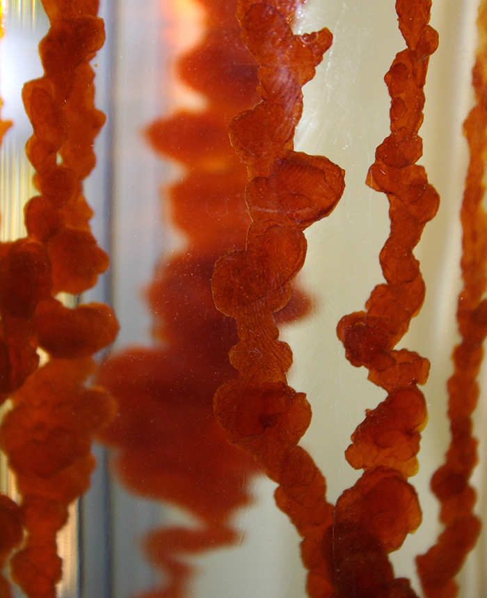 In a demonstration conducted at The Huntington, William R. Newman produced a bright red metallic “tree” made of silica that grew and branched as his lecture proceeded. Detail from a photograph by William R. Newman.