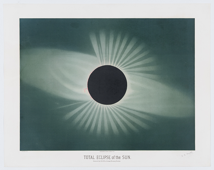 Étienne Trouvelot’s chromolithograph of the 1878 total solar eclipse that he observed in Creston, Wyoming Territory. The August 21, 2017, total solar eclipse will pass through Wyoming again. Jay T. Last Collection of Graphic Arts and Social History. The Huntington Library, Art Collections, and Botanical Gardens.