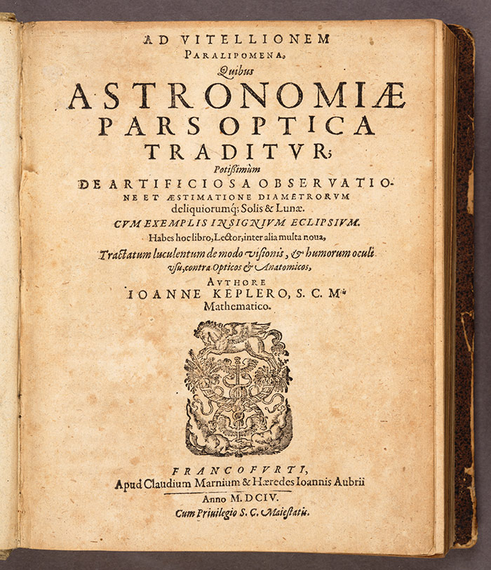 The title page of Ad Vitellionem paralipomena quibus astronomiae pars optica traditvr, 1604, by the German astronomer Johannes Kepler (1571–1630). In this book, better known as Kepler’s Optics, Kepler commented on the sun’s corona during a solar eclipse. He erroneously believed it to be the atmosphere of the moon. The Huntington Library, Art Collections, and Botanical Gardens.