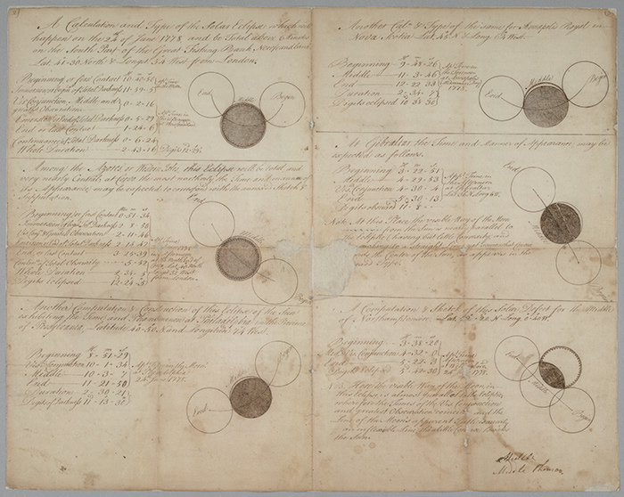 Thomas Cowper’s calculations and drawings of a solar eclipse, as observed in England, Nova Scotia, Pennsylvania, and Newfoundland on June 24, 1778. The Huntington Library, Art Collections, and Botanical Gardens.