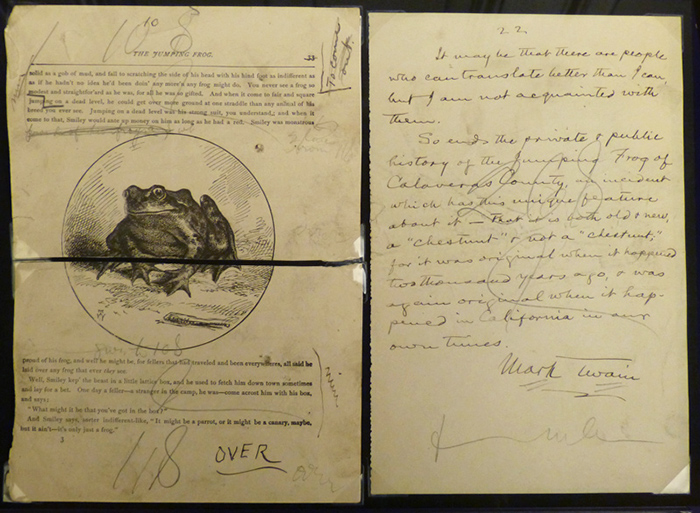 A 1983 newspaper article by Murphy led to another notable Huntington acquisition—a manuscript collection that included Mark Twain’s handwritten “Private History of the ‘Jumping Frog’ Story,” currently on display in “Remarkable Works, Remarkable Times: Highlights from the Huntington Library.”