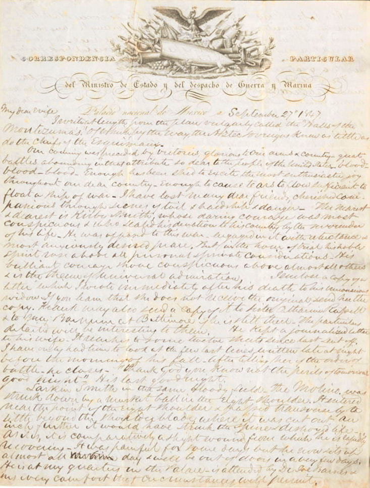 In September 1847, he wrote to his wife, Eliza, from the National Palace in Mexico City. In an acerbic aside, he mentioned that he was writing from the place that the pro-war crowd “vulgarly” styled ”the Halls of the Montezumas of which by the way, the Aztec knew as little as do the chiefs of the Esquimaux [Eskimo].” Kirby continued: “Our coming here was preceded by victorious, glorious to our arms & country great battles abounding in that attribute so dear to the people of the United States—blood—blood—blood. Enough has been shed to excite the most enthusiastic joy throughout our dear country—enough to cause tears to flow sufficient to float a ship of war."