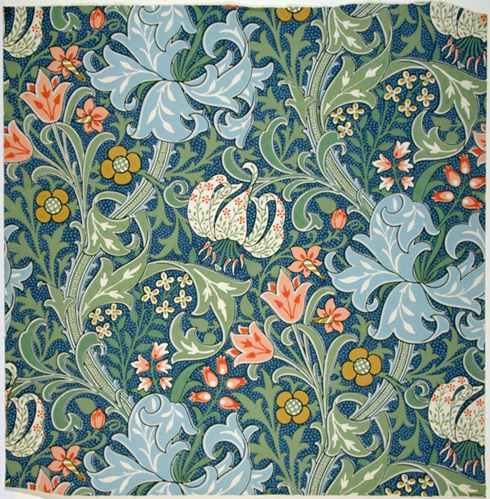 Among the most successful items sold by Morris & Co. were wallpapers decorated with patterns inspired by nature. In 19th-century Britain, wallpapers were the chief wall decorations for domestic interiors, but almost all were stylistically undeveloped, merely simulating the effect of fabric coverings that only the very rich could afford. In contrast, the Morris & Co. wallpaper Golden Lily, designed by Dearle, shows the originality of the firm’s designs. It features a variety of flowering plants with pink, yellow, and blue flowers, as well as green and blue foliage, on a dark-green ground covered with green dots. This type of design enriched the wall surface, giving it depth, movement, and vitality.