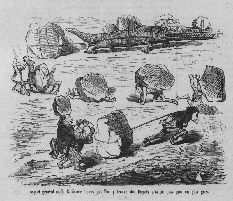 The book is less about the French in California than it is about how gold fever played out in France during the Second Republic, a period of French history bookended by the Revolution of 1848 and the rise of the Second Empire in 1852. This brief period was characterized by a proliferation of newspapers, humor magazines, and novels. Rohrbough shows how news from California influenced popular culture, including cartoons by an artist named Cham (né Amedée de Noé) that showed the widespread availability of gold in California in the form of massive boulders (see below).