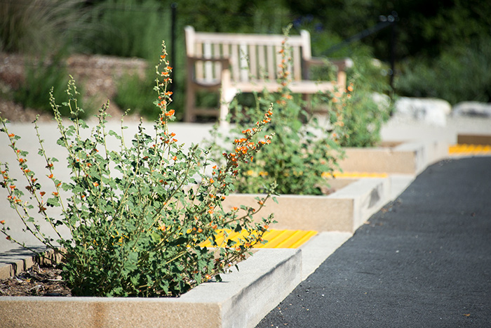 Sphaeralcea ambigua, desert mallow, thrives in extremely hot, dry areas, such as this concrete planter near the bus drop-off area. Shown here is the variety with apricot-colored blooms. Photo by Kate Lain.