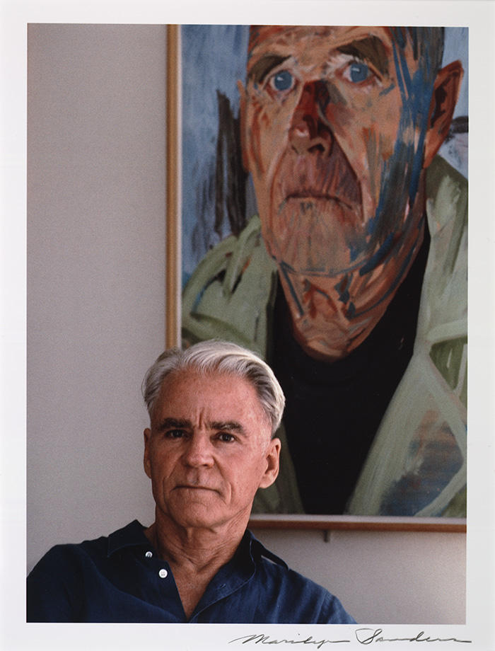 Don Bachardy in 1991, posing in front of his portrait of novelist Christopher Isherwood (1983). Photo by Marilyn Sanders, reproduced by permission. The Huntington Library, Art Collections, and Botanical Gardens.