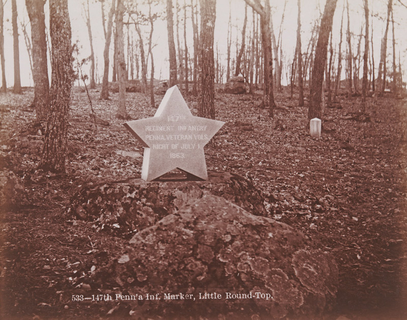 Monument to the 533-147th Pennsylvania Infantry at Little Round Top, site of an unsuccessful assault by Confederates on the second day of the Battle of Gettysburg. This photo is from a book published by the Gettysburg National Military Park Commission, The Location Of The Monuments and Tablets On The Battlefield Of Gettysburg, 1898.