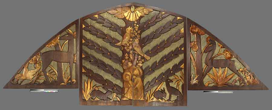 Sargent Claude Johnson, Screen , 1937, 105 x 264 x 2 in. (266.7 x 670.6 x 5.1 cm.), carved, gilded, and painted redwood. Purchased with funds from the Art Collectors’ Council, the Connie Perkins Endowment, and the Virginia Steele Scott Acquisition Fund for American Art in honor of George Abdo and Roy Ritchie. The Huntington Library, Art Collections, and Botanical Gardens.