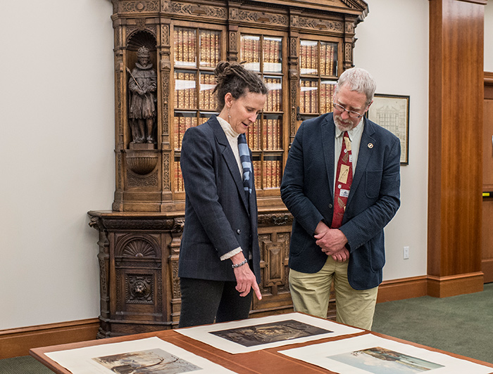 Pulitzer Prize–winning historians Elizabeth Fenn and Alan Taylor looking at items from The Huntington’s collections that informed their award-winning books. Photo by Martha Benedict.