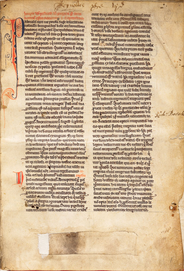 Pope Gregory the Great (ca. 540–604), Cura Pastoralis, in Latin, 32 leaves. This hand-decorated manuscript on vellum was owned by and probably written at the Reading Abbey in Berkshire, England, around 1225–1250. Huntington Library, Art Collections, and Botanical Gardens.