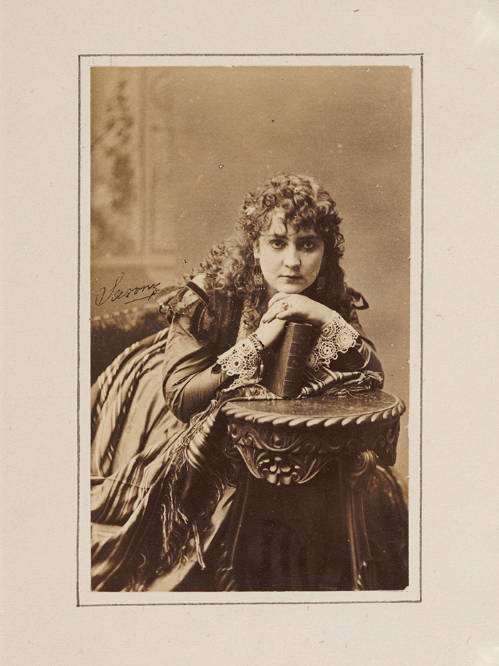 A: I feel convinced that this was a loving tribute to Menken, created by celebrated theatrical entrepreneur Augustin Daly (1838–1899). The Huntington purchased the volume at a 1900 estate sale of Daly’s. Inside the volume was a letter to Daly in Menken’s hand. “I write in memory of one of the pleasantest incidents of my life—our old acquaintanceship,” Menken wrote. I also learned that Daly was known to have collected photographs of famous actors, many of them taken by the same Sarony. Menken’s letter implores Daly to write to her. I have no way of knowing whether he acted on her invitation.