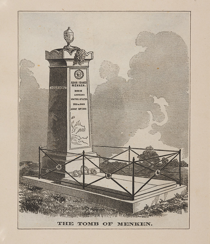 Engraving of Menken’s tomb in Montparnasse Cemetery, with the inscription “Thou Knowest.” The Huntington Library, Art Collections, and Botanical Gardens.